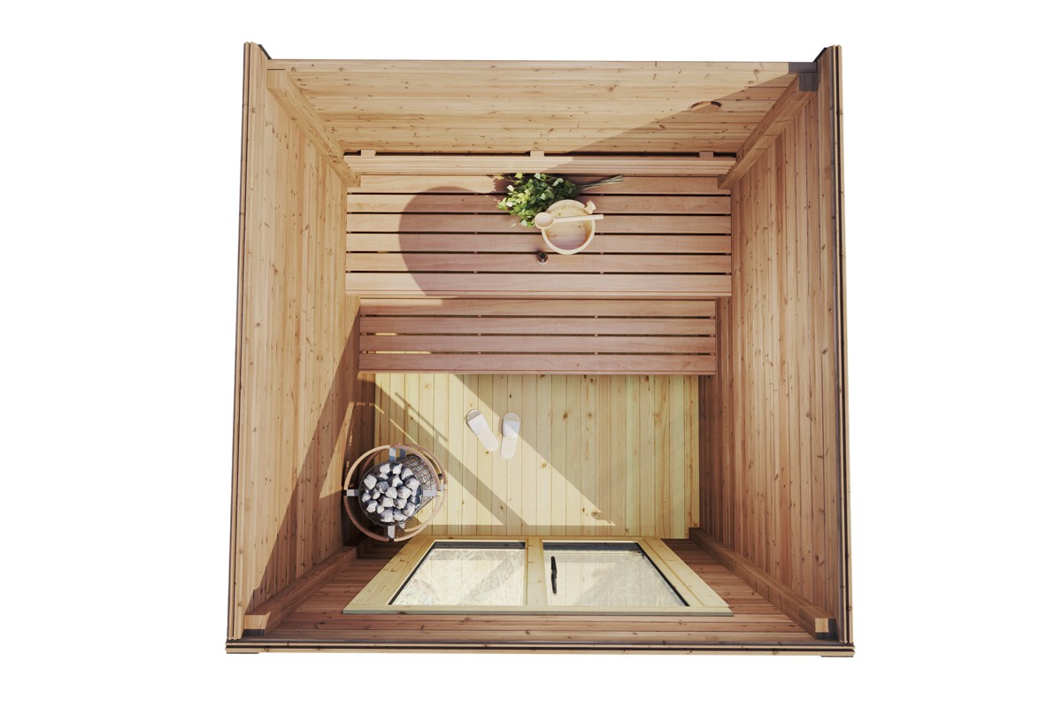 Lisätiedot: Kaikkien pihasaunojen pakettiin kuuluu lisävarusteet: löylyhuone, saunalauteet, löylyhuoneen sisäkaton paneeli, 8 mm lasinen saunaovi, päänojat, kiuassuoja ja puiset lattiaritilät.
